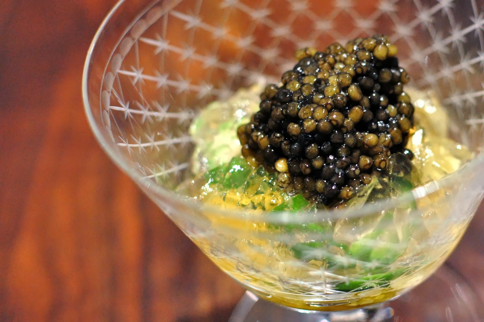 | Salad of little gems with smoked trout, English cucumber ribbons, scallion crème fraiche, picked red onions, crispy capers, the French laundry garden tomatoes and everything vinaigrette |